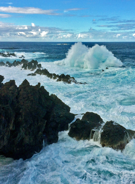 Man har här ringat in en rad svarta lavaklippor och fått en stor naturlig havspool, där ytterkanten hela tiden sköljs över av stora dyningar! Ibland så höga vågor att poolen var stängd, som den var för oss första dagen. Men vacker miljö var det onekligen!