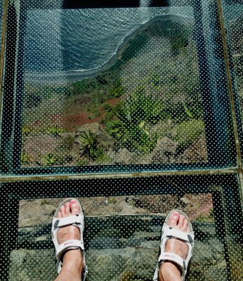 Lägenheten låg bara några hundra meter från den kända klippavsatsen Cabo Girao som är en av världens högsta klippavsatser. Nedanstående foto visar utsikten mot Camara de Lobos.Här kan man gå ut på den transparenta plattformen varifrån man kan titta ner 581 meter….