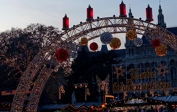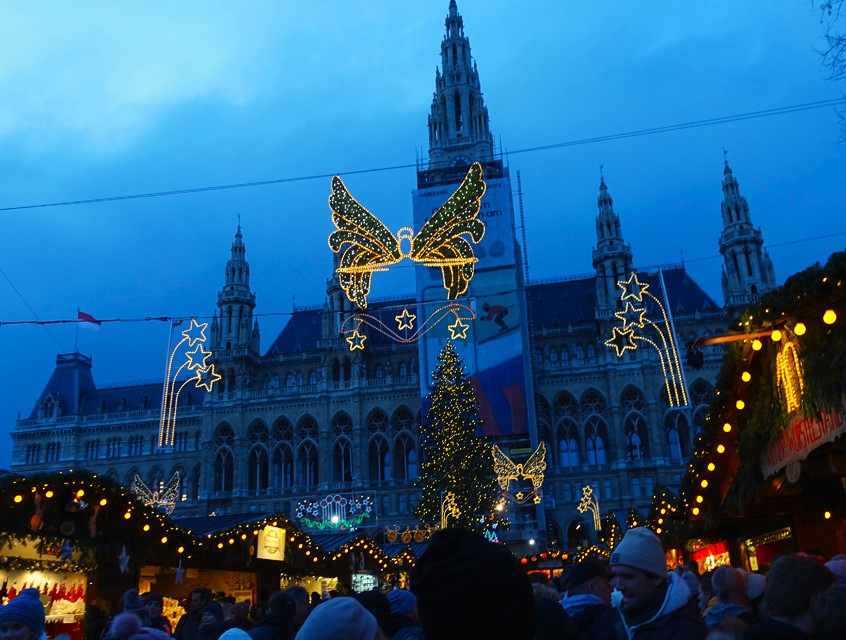 Fotot ovan: Den mest pampiga julmarknaden ”Rathhaus” hittar du framför Stadshuset! …..och är förstås allra vackrast när Stadshuset är fullt upplyst!